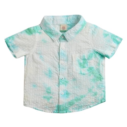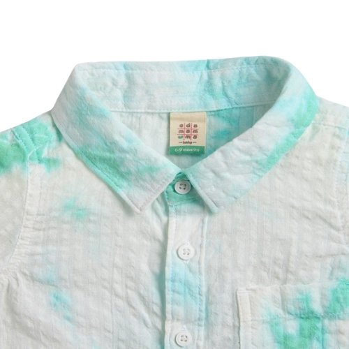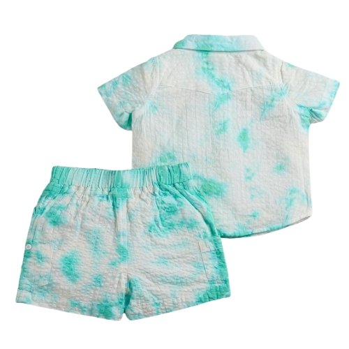 A trendy infant boys’ tie & dye co-ord set in green, featuring a cool button-down shirt with a pocket. Perfect for 6-9 months old babies. Comfortable, stylish, and easy to wear!